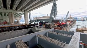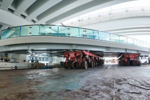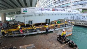 (三)完成製造組件後以工程船逐一運到香港,工程船需配合潮水高度,在水位合適時駛到東區走廊下,繼而利用「自走式模組運輸車」將板道組件準確地移到指定位置上安裝,這樣才能免卻現場搭建臨時棚架及模板的大量工序。