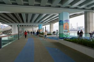 土木工程拓展署高級工程師楊思翔介紹,東岸板道全長約2.2公里,項目分兩階段完成。已開放的西段屬首階段完成的部分,長約1.1公里,包括700米連接東岸公園主題區至北角海濱花園的板道,以及400米經優化的北角海濱花園 。至於餘下部分的板道(即北角至鰂魚涌的東段),計劃於今年下半年陸續開放,屆時「一板貫通,暢踏西東」,整條長約13公里連貫堅尼地城至筲箕灣的海濱長廊便可正式打通。
