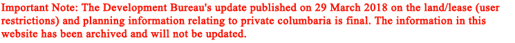 Important Note: The Development Bureau's update published on 29 March 2018 on the land/lease (user restrictions) and planning information relating to private columbaria is final. The information in this website has been archived and will not be updated.
