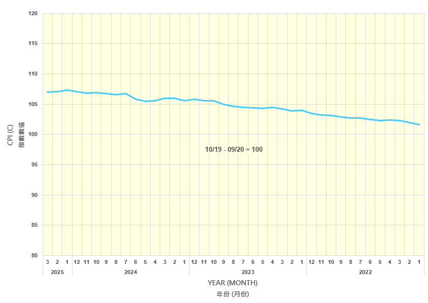 The CPI(A), CPI(B) and CPI(C) are compiled based on the expenditure patterns of households in the relatively low, medium and relatively high expenditure ranges. By aggregating the expenditure patterns of all households covered by the above three indices, a Composite CPI is also compiled to reflect the impact of consumer price changes on the household sector as a whole. The year-on-year rate of change in this index is generally taken to reflect overall consumer price inflation.