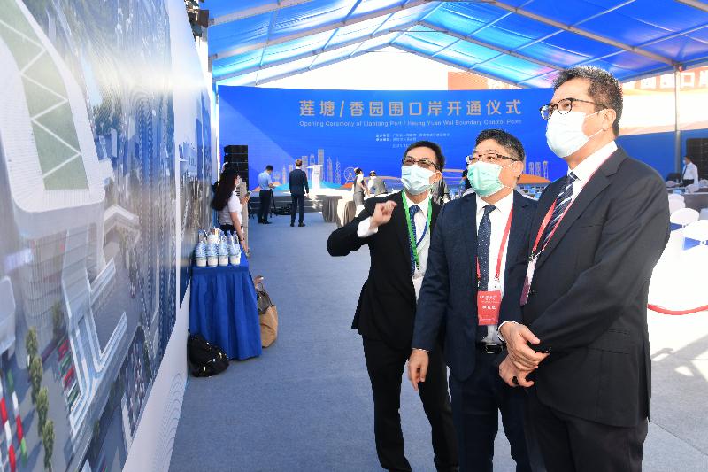 The cargo clearance facilities of the Liantang Port (LP)/Heung Yuen Wai (HYW) Boundary Control Point (BCP) opened today (August 26). The Chief Executive, Mrs Carrie Lam; the Secretary of the CPC Guangdong Provincial Committee, Mr Li Xi; the Governor of Guangdong Province, Mr Ma Xingrui; Deputy Director of the Hong Kong and Macao Affairs Office of the State Council Mr Zhang Xiaoming; the Director of the Liaison Office of the Central People's Government in the Hong Kong Special Administrative Region (HKSAR), Mr Luo Huining; the Director General of the Guangdong Sub-Administration of the General Administration of Customs, Mr Zhang Guangzhi; the Head of the National Office of Port Administration of the General Administration of Customs, Mr Huang Guansheng; the Secretary of the CPC Shenzhen Municipal Committee, Mr Wang Weizhong; and the Mayor of the Shenzhen Municipal Government, Mr Chen Rugui, jointly officiated at the opening ceremony of the BCP at the Customs Cargo Inspection Area of the LP in Shenzhen.