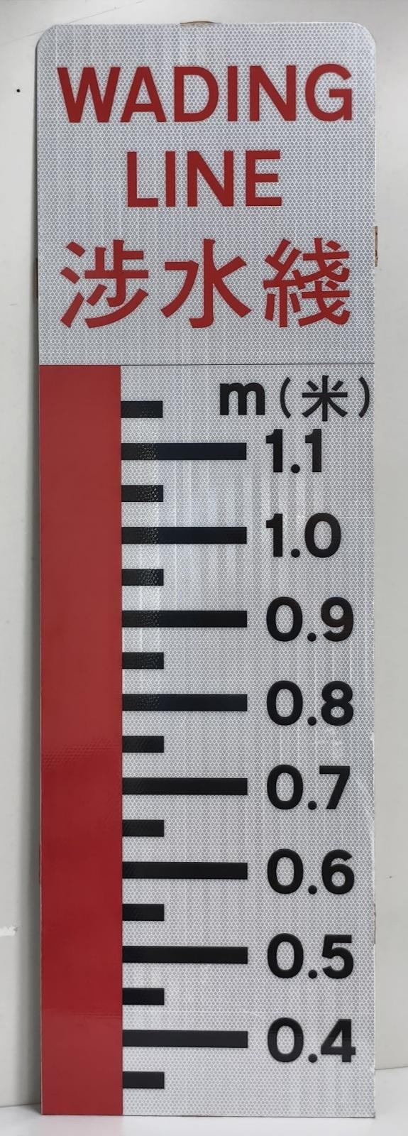 Warning signs of the system will be placed at low-lying road sections, including a red wavy line and the words "Wading Line" painted on the road surface, with a water meter gauge placed next to it and a sign erected next to the carriageway. When the water level has reached or submerged the wading line, it indicates that the depth of the water at the lowest point of the road ahead has reached 0.3 metre or above.