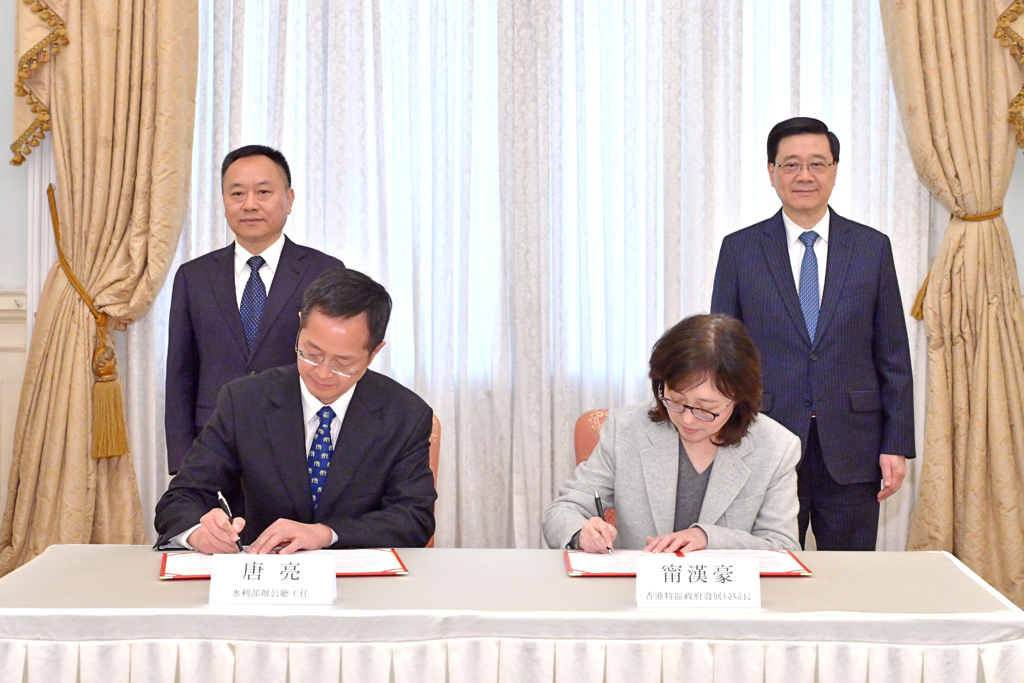 The Chief Executive, Mr John Lee, met with the Minister of Water Resources, Mr Li Guoying, at the Government House today (April 1) to witness the signing of an arrangement between the Ministry of Water Resources and the Hong Kong Special Administrative Region (HKSAR) Government on the management and co-operation of water-related affairs.