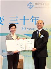 Mrs Lam and Mr Xu expressed gratitude towards those who have participated in the Shenzhen River Regulation Project. Together with other officiating guests, they presented the 30th Anniversary Special Contribution Awards to 10 staff members from Hong Kong and Shenzhen to commend their remarkable achievements in the project.