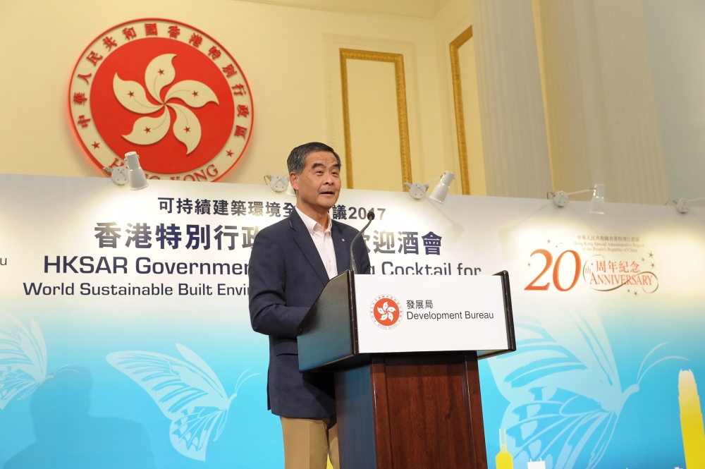 The Chief Executive, Mr C Y LEUNG, delivers a welcoming speech as the guest of honour at the Hong Kong Special Administrative Region Government welcoming cocktail.