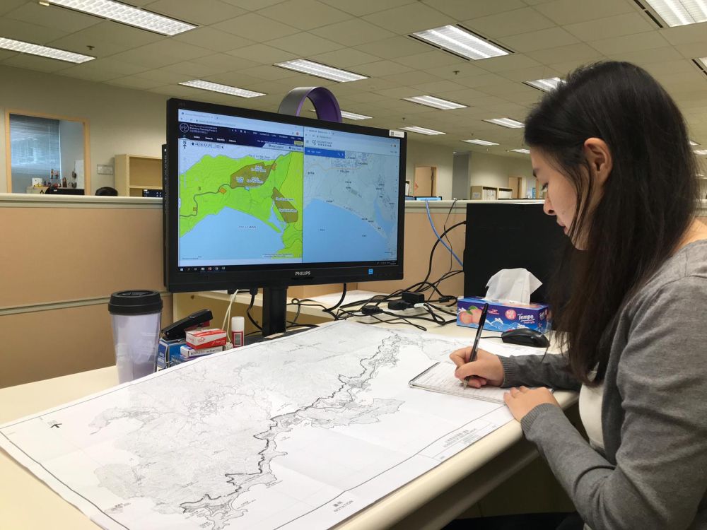 Sharon has had chances to go on site visits to Lantau with her colleagues during her internship. The picture shows her gathering information in preparation for a visit.