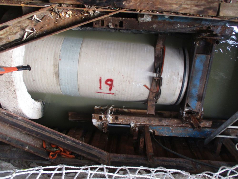 | Slip-lining method: (from top to bottom) 1. Setting up a temporary shaft; 2. cutting part of the old pipeline for cleaning and inspection; 3. pushing a fibreglass plastic liner into the original pipe section by section; 4. filling the gap between the new and the old pipelines with cement slurry to form a new pipe. |