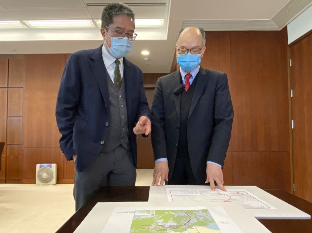 The Secretary for Development (SDEV), Mr WONG Wai-lun, Michael (left), and the Secretary for Transport and Housing (STH), Mr CHAN Fan, Frank (right), jointly introduce the details of the Northern Link (NOL) project.