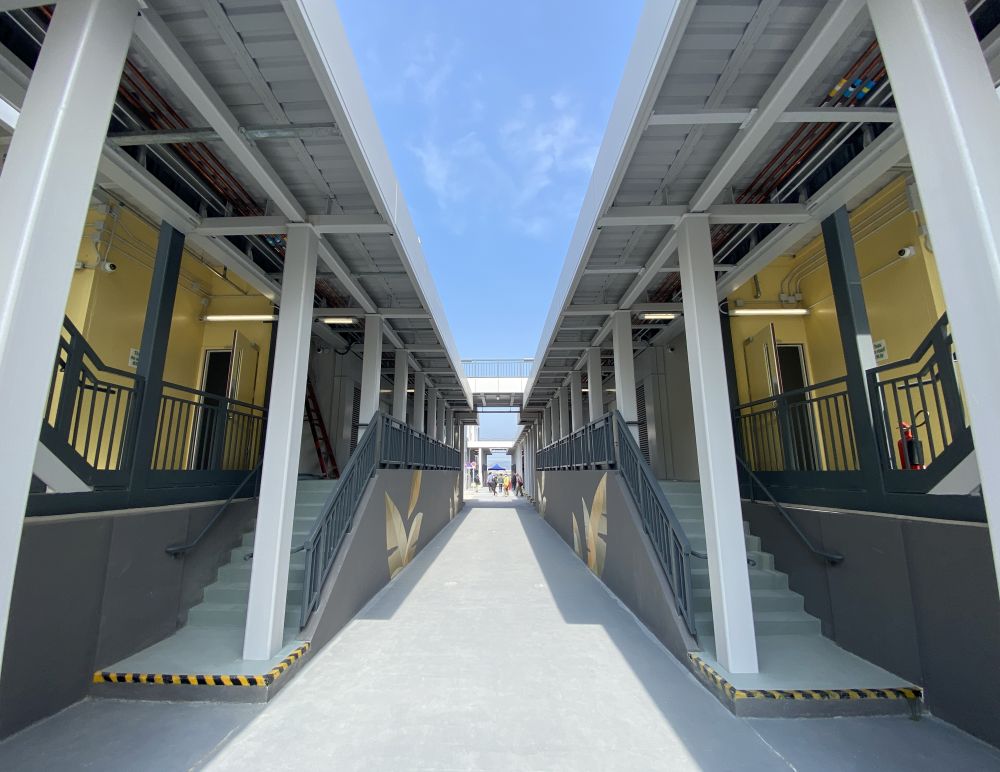 | The overall hospital layout is based on the idea of separating the healthcare staff and patients, i.e. the central corridors of the six blocks are reserved for delivery of clean supplies and access by healthcare staff while medical waste is taken away through the outside corridors. |