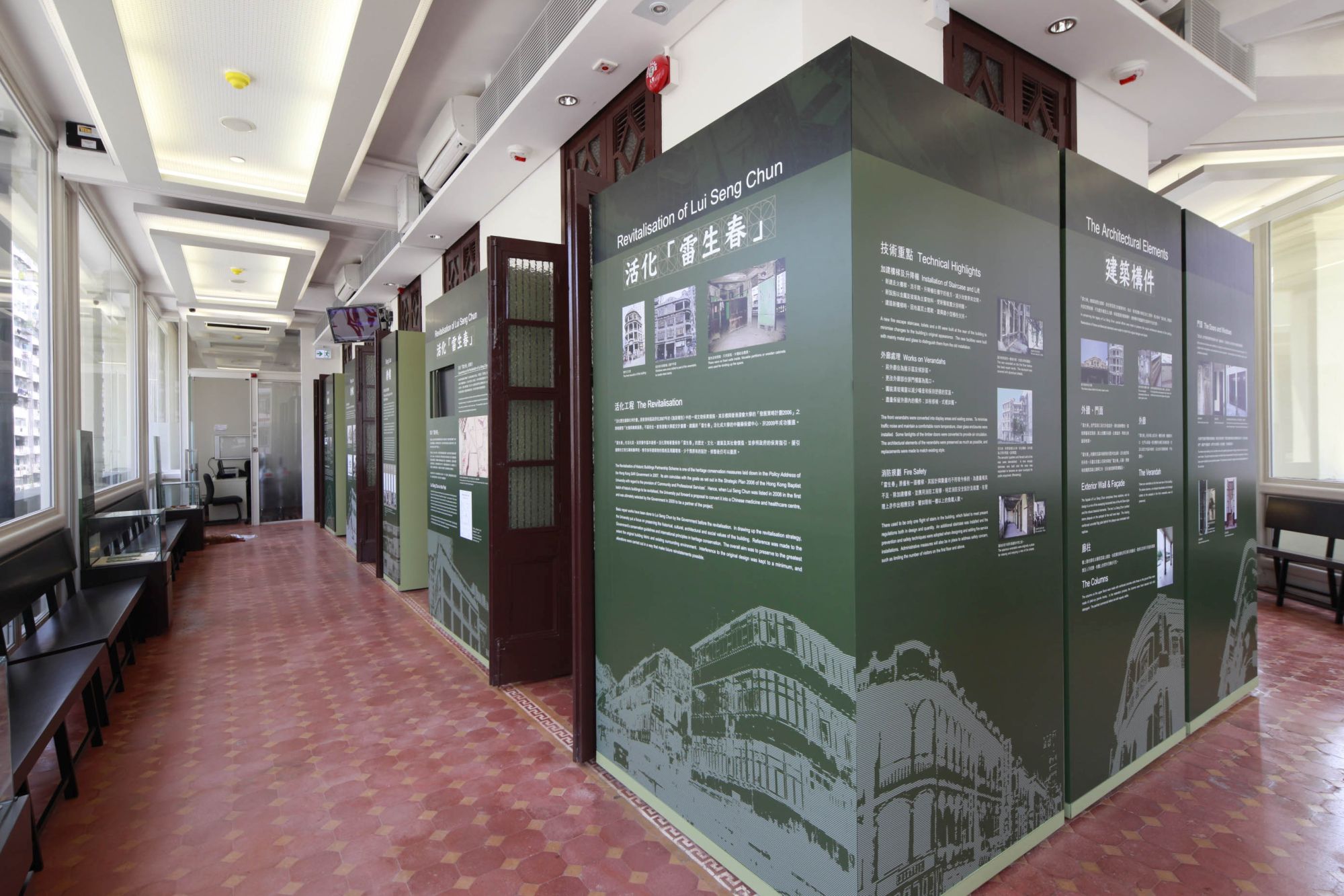 There is an exhibition on the verandahs introducing the revitalisation project of Lui Seng Chun, and the architectural features of tong lau.
