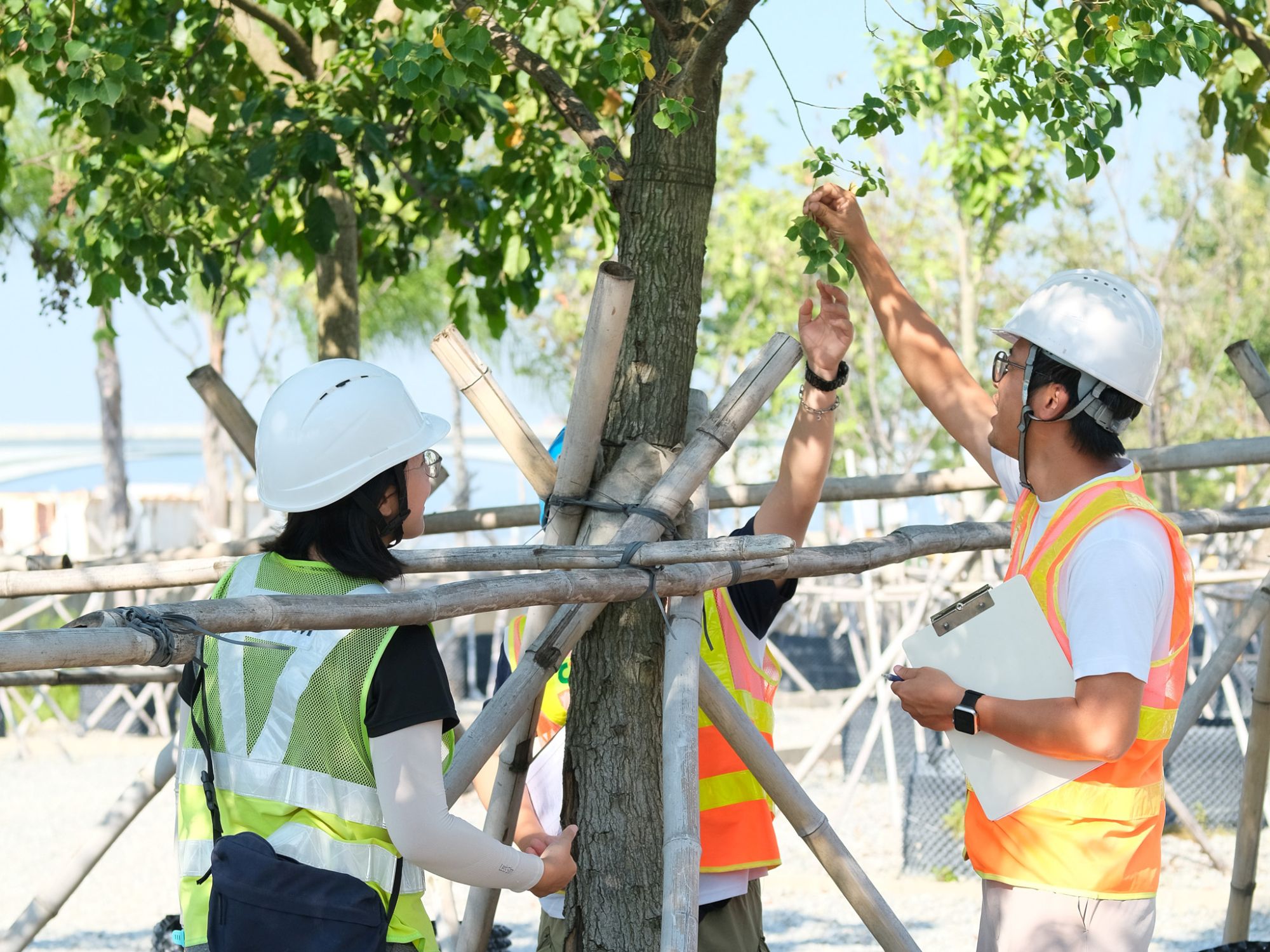 園境師聯同駐地盤人員和承建商定時觀測和記錄試驗苗圃內的樹木的狀況,並按照實際生長情況進行相應的樹藝工作,圖示團隊正觀察樹木的根部生長狀況。
