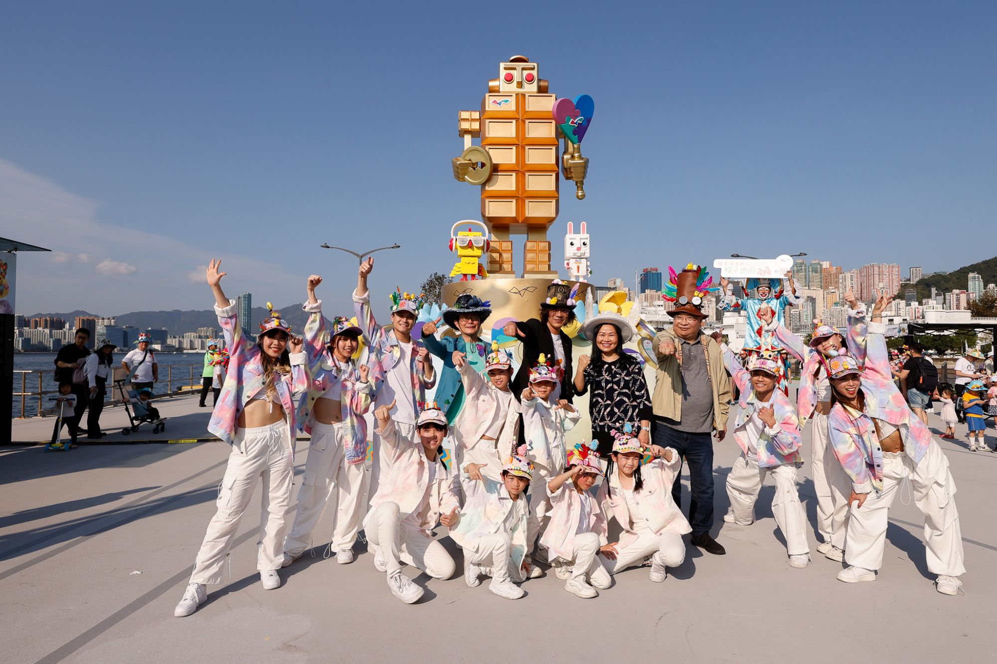 | The then Chairpersons of the HC and its Task Forces, Mr Vincent NG (middle); Mr Ivan HO (fourth from left); Prof Becky LOO (fifth from right); and Mr LEUNG Kong-yui (fourth from right), posed for a memorable group photo with performers at the “Easter Hat Parade @ Victoria Harbour 2024”. |