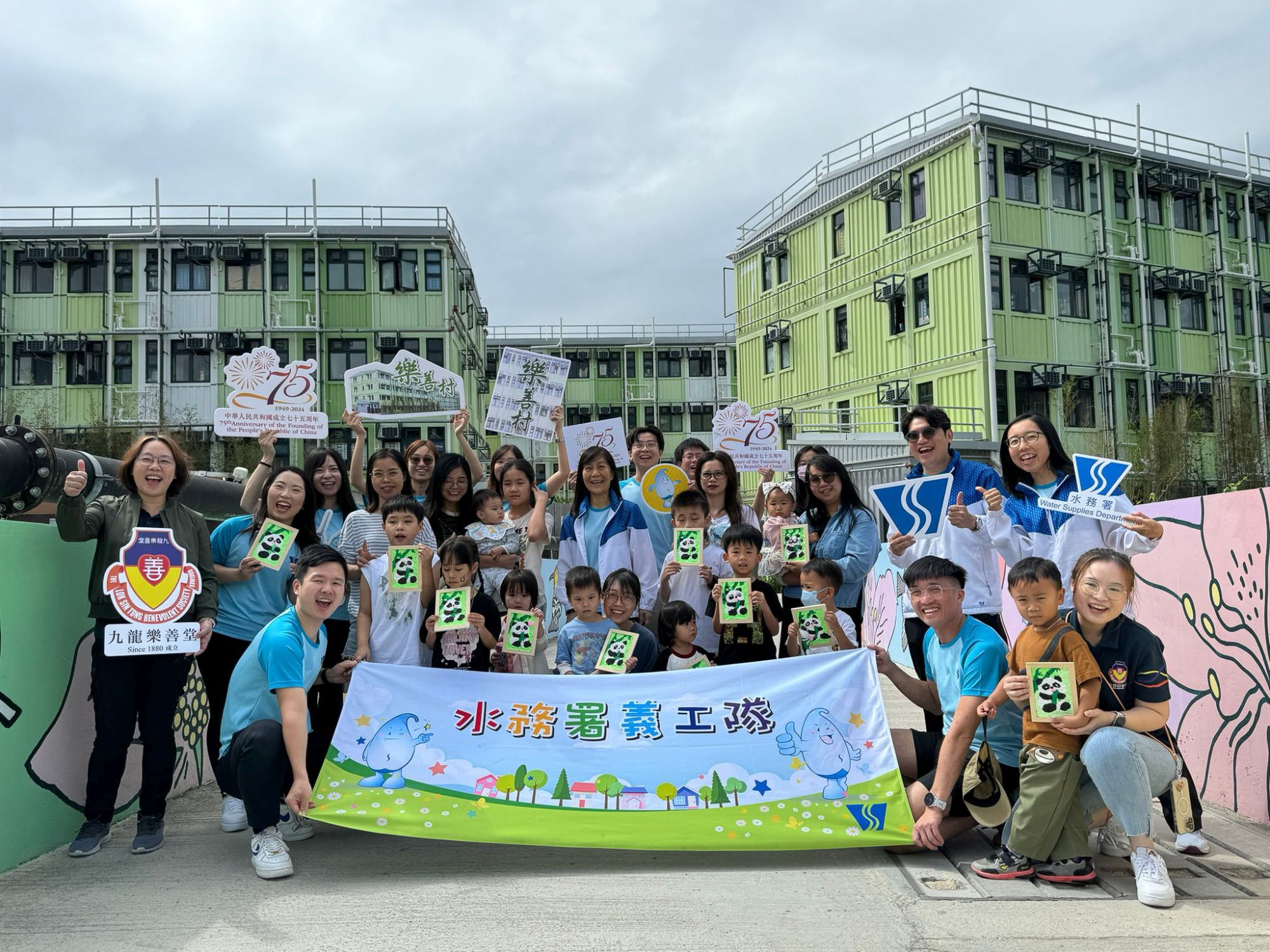 水務署工程師鄭子謀(前排左一)表示,部門近年成立青年義工隊,希望將團隊年輕化。水務署工程師譚家欣(後排右一)希望透過與子女共同參與義工服務,達至傳承的效果。
