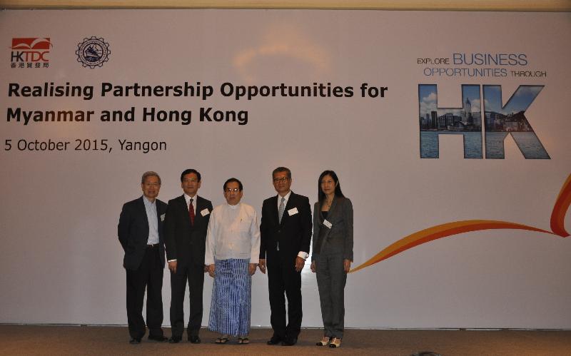 | Mr Chan (second right), Vice-President of UMFCCI, Mr U Zaw Min Win (middle), Chairman of the HKTDC Infrastructure Development Advisory Committee, Mr Tony Tse (second left), Conveyor of Working Group on Professional Services, the Economic Development Commission, Mr Lau Ping-cheung (first left) and Director of Service Promotion of the HKTDC, Ms Jenny Koo (first right) take a group photo at the luncheon. |