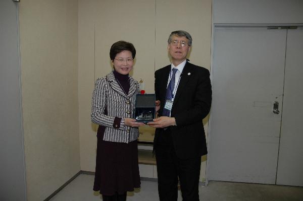 The Secretary for Development, Mrs Carrie Lam, presents a souvenir to Chief of Protocol, Tokyo Metropolitan Government Mr Toshiyuki Taga.