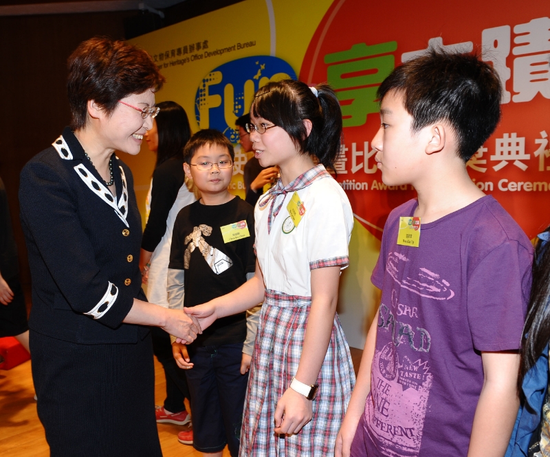 The Secretary for Development, Mrs Carrie Lam, chats with the award winners of the Historic Buildings Drawing Competition.