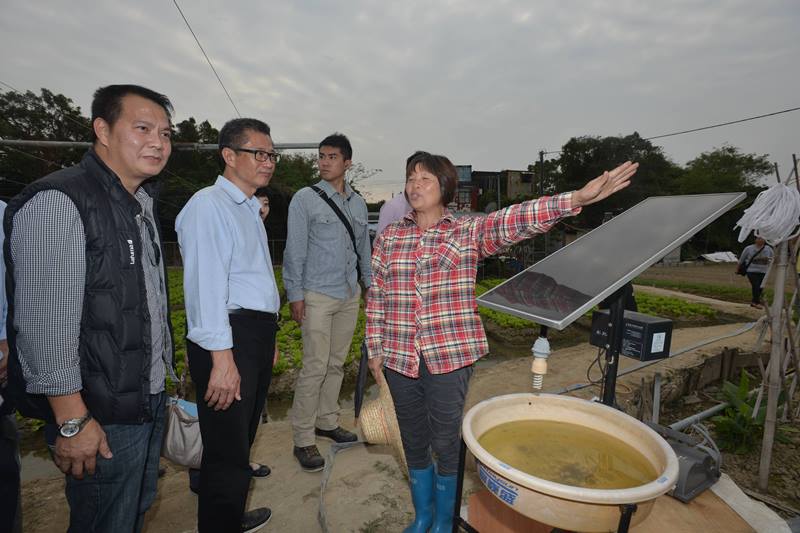 A farmer explains to Mr Chan (second left) a solar powered device..
