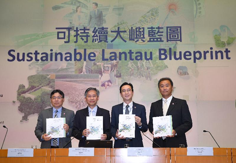 | The Secretary for Development, Mr Eric Ma (second right), holds the Sustainable Lantau Blueprint Press Conference today (June 3). The Permanent Secretary for Development (Works), Mr Hon Chi-keung (second left); the Director of Civil Engineering and Development, Mr Lam Sai-hung (first left); and the Director of Planning, Mr Raymond Lee (first right), are also present. |