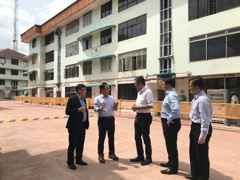| The Secretary for Development, Mr Michael Wong, today (January 14) continued his visit to Singapore. Together with the Permanent Secretary for Development (Works), Mr Lam Sai-hung (first left), and the Principal Government Engineer, Mr John Kwong (second right), Mr Wong (centre) visited a private residential project under construction. The project will feature the tallest modular integrated construction buildings in the world when completed. Photo shows Mr Wong being briefed on how five historic buildings are being preserved during the construction process. The building in the background of the picture is one of the five old buildings being preserved. |