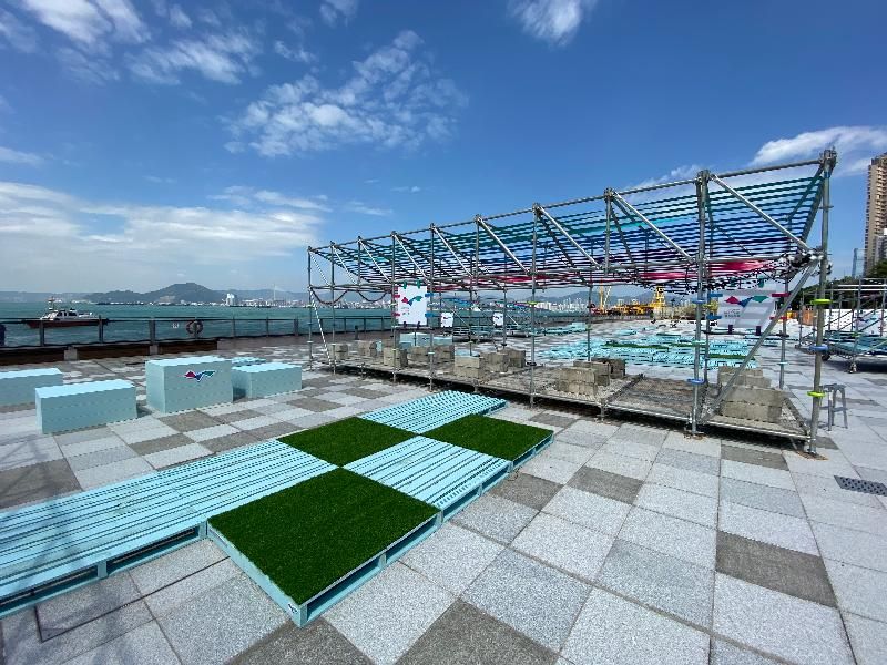| The Belcher Bay harbourfront open space located at Shing Sai Road, Kennedy Town, was fully opened today (October 19), providing the public with a round-the-clock leisure space for enjoying a panoramic view of the western waters of Victoria Harbour and the sunset. Photo shows the multipurpose space located at the centre of the site. Its activity platforms and seatings are produced mainly by wooden cargo pallets, allowing members of the public to enjoy the space in a versatile manner according to their imagination. |