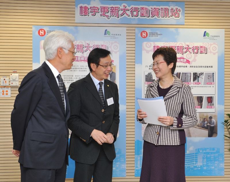| The Secretary for Development, Mrs Carrie Lam (right), chats with the Chairman of the Hong Kong Housing Society (HKHS), Mr Yeung Ka-sing (left), while touring the "Operation Building Bright" corner at the HKHS' Property Management Advisory Centre. |