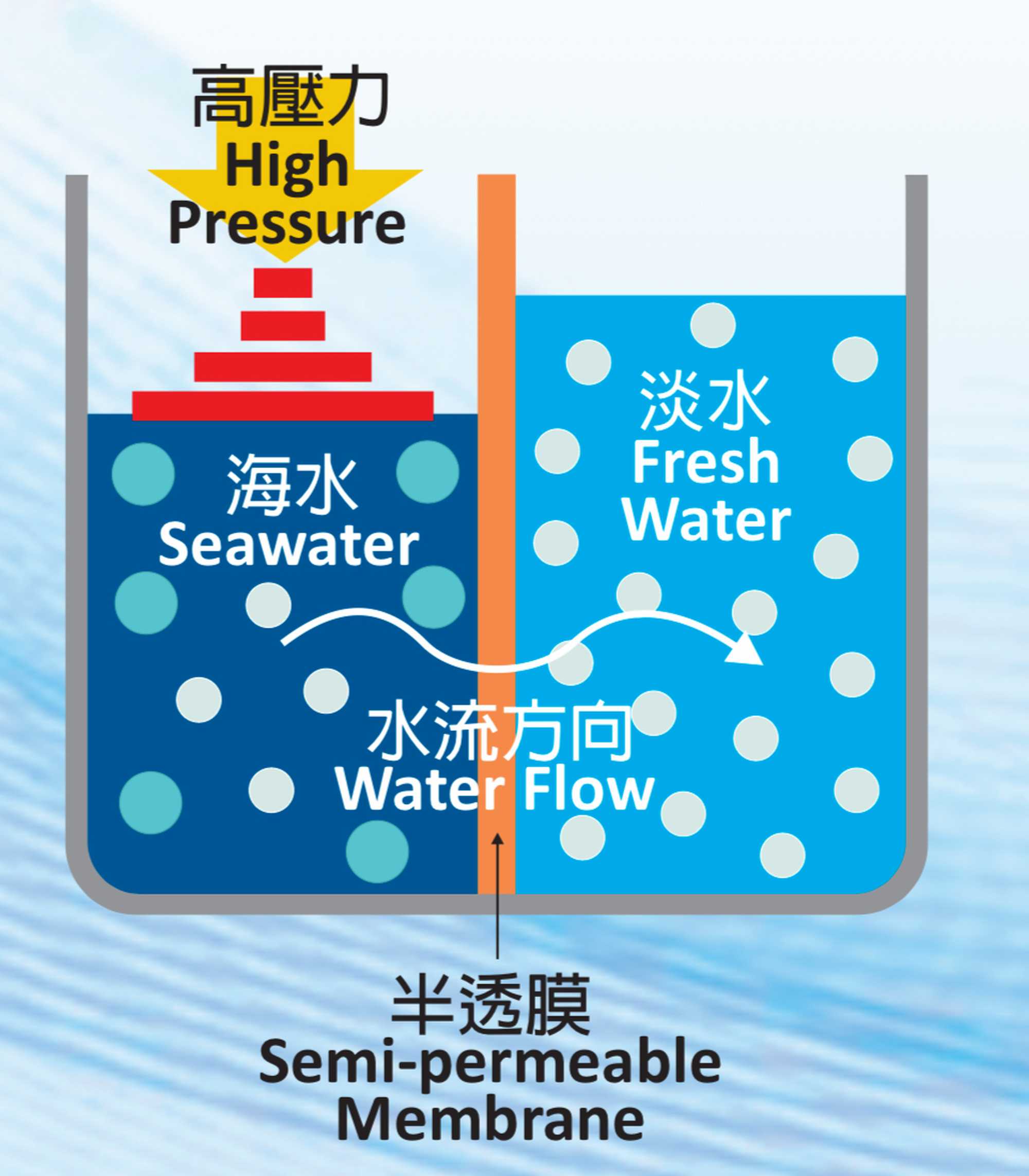 逆渗透的原理是透过向含盐分的海水加压,使水份通过半透膜流向淡水方向,半透膜会阻挡盐分、杂质和微生物等,以净化海水。