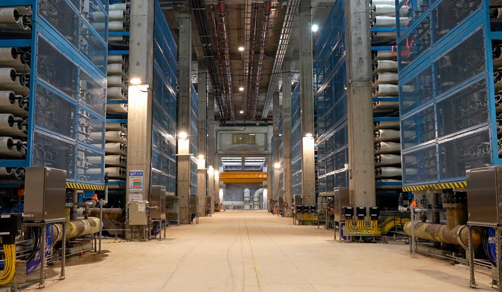 海水化淡厂第一阶段设有12个大型逆渗透组件,安装合共2,336支压力管道,每支压力管道内装有7支半透膜滤芯。