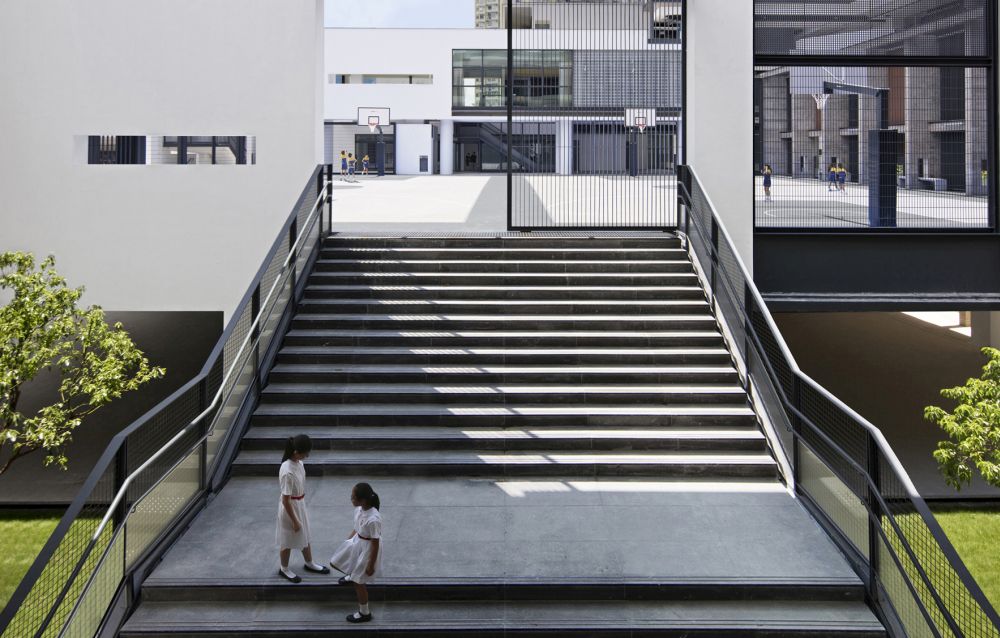 學生可沿着樓梯、走廊和接橋到達不同的戶外空間,例如籃球場、圖書館、天台花園等。