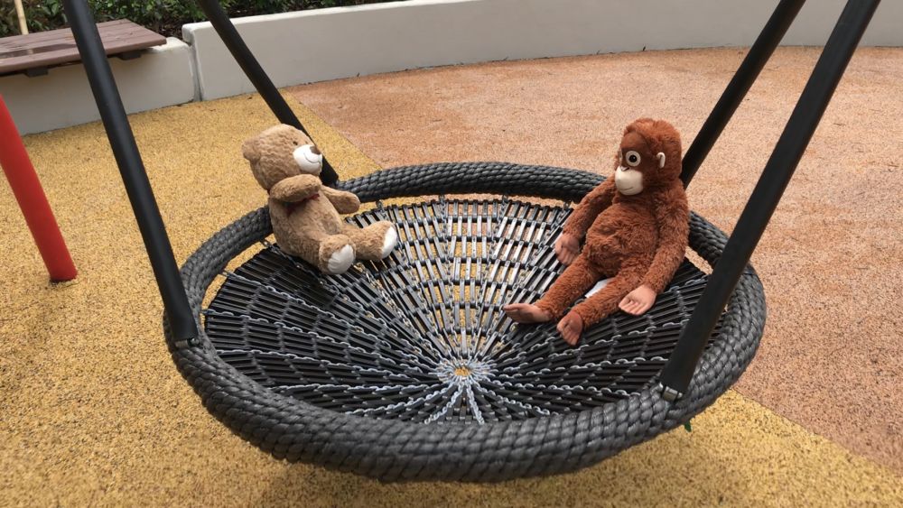 遊樂場新增一個韆鞦區,韆鞦的設計鼓勵小朋友跟父母或朋友一同盪鞦韆。