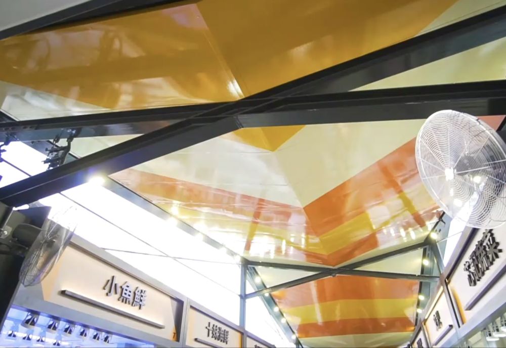 街市天花髹上不同的主題色彩—藍、橙、綠,與攤檔售賣的新鮮食物可謂互相呼應。