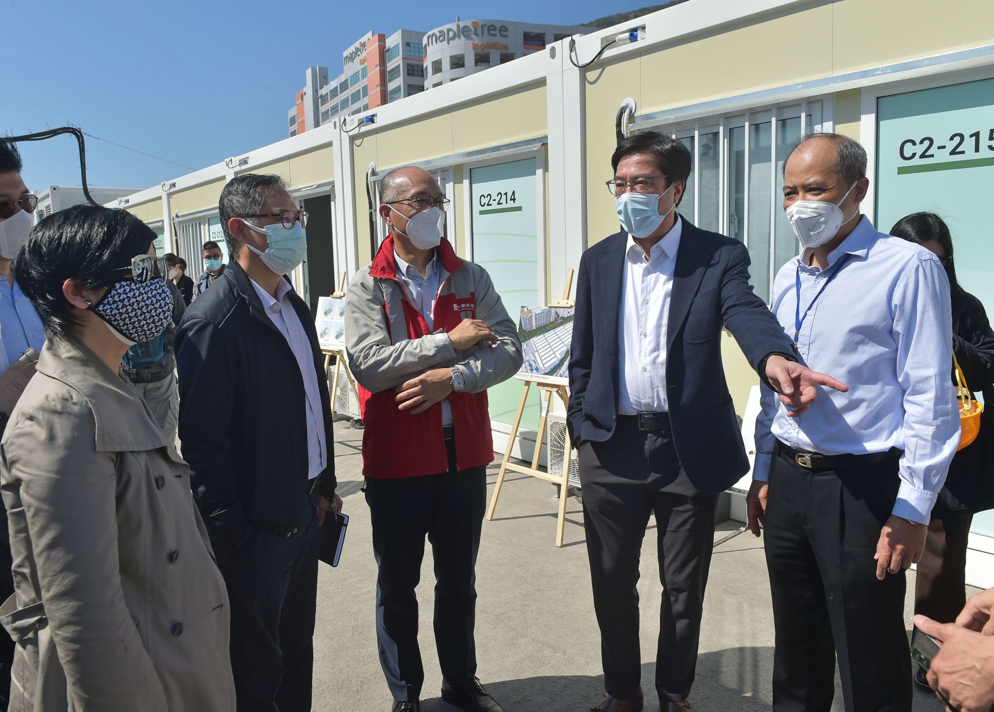 發展局局長黃偉綸(右二)、發展局常任秘書長(工務)劉俊傑(左二)、建築署署長何永賢(左一)等日前(3月1日)視察青衣的社區隔離設施。