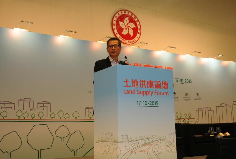 發展局局長陳茂波今日(十月十七日)在發展局和五個專業團體合辦的「土地供應論壇」上致辭。五個專業團體分別是香港測量師學會、香港規劃師學會、香港建築師學會、香港工程師學會和香港園境師學會。