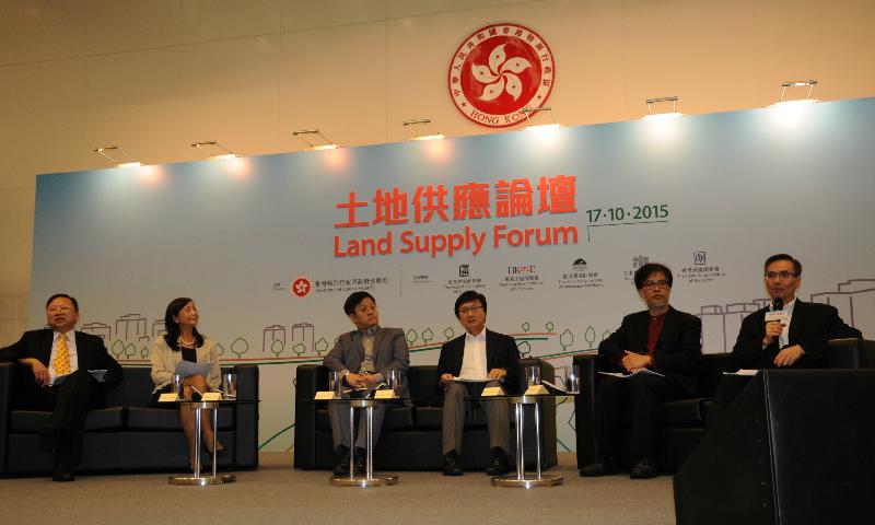 「土地供應論壇」第一節探討土地供應的挑戰。主講和參與討論的嘉賓有(左起)香港測量師學會代表陳東岳、香港規劃師學會代表麥凱薔博士、關焯照教授、林奮強和何建宗教授。