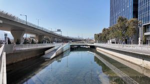 另外,為方便市民穿梭河道兩岸,團隊沿河興建了六條跨河行人通道及一個浮島,縮短河道兩岸的步行距離,藉此連結觀塘區內的工商業區、住宅,以及觀塘和茶果嶺海濱空間。為了美化河道景觀,渠務署在隨水位高低而升降的浮島上設置特色漏斗型花盆及座位,為市民提供獨特的近水體驗。河道亦栽種植物和設置生態裝置,創造有利生態的環境。其中,鳥桿提供雀鳥歇息及覓食的位置;岩石池提供魚類棲息及繁衍的空間;生態牆吸引各種生物依附,提供庇護及覓食環境,吸引更多物種棲息。