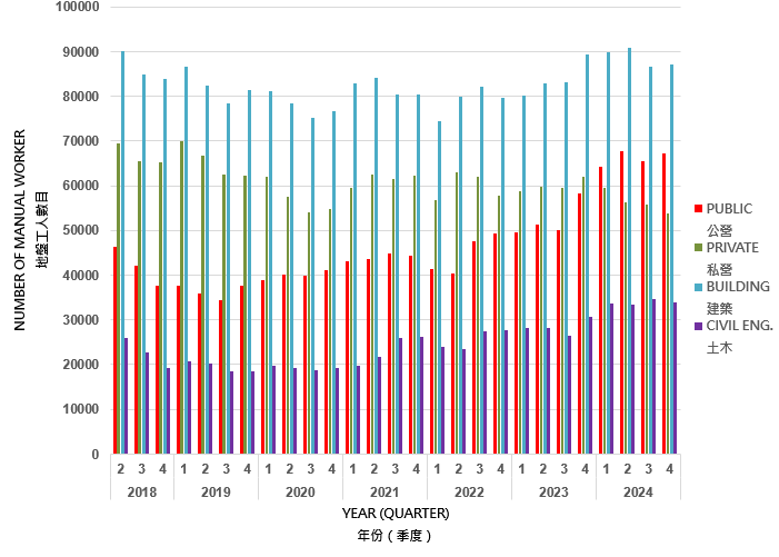 在建築及土木工程地盤工作的地盤工人數目,按公營及私營或工程類別(建築及土木)加以劃分。這些資料以政府統計處所進行的「建築地盤就業人數按季統計調查」結果作為依據。