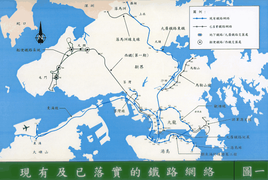 認識鐵路在公共運輸系統的重要角色,香港政府於一九九三年完成了對鐵路發展的整體研究。研究的結果及建議成為政府在一九九四年出版的鐵路發展策略的基礎,該策略提供一個供擴展香港鐵路網絡的藍圖。建議的優先發展計劃現已在不同的實施階段。圖1 載錄了現存及已落實興建的鐵路網絡。
