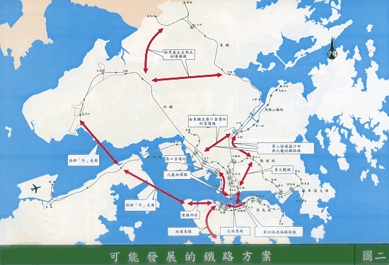 上述研究指出多條可行的新鐵路線,經合理的組合,將可大大紓緩鐵路網絡內的瓶頸地帶,並可支援本港境內新發展地區的發展。這些可能發展的新鐵路線載於圖2 。上述研究亦測試了這些鐵路線於不同的組合情況下,對紓緩所發現的鐵路系統瓶頸地帶、提高鐵路載客量、及更平均分布網絡流量的效力。現正根據交通、工程、環境、經濟及財政等準則評核各個組合的表現。評估結果有助於找出一個「核心網絡」的組成部分。視乎日後發展及其他外在因素,實施網絡各組成部分的優次先後及時間將可決定。這亦將成為特別行政區下一階段鐵路發展的藍圖。