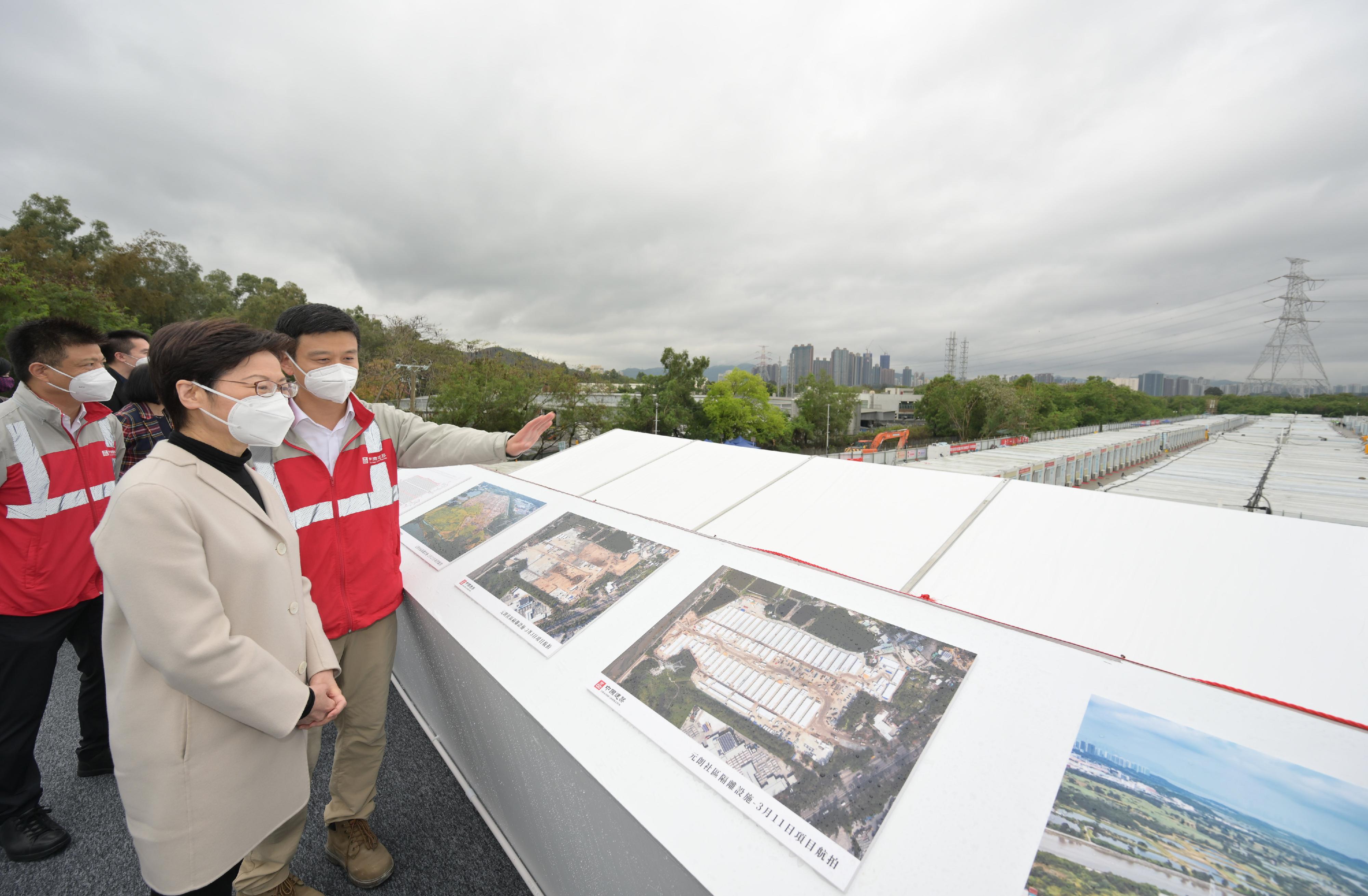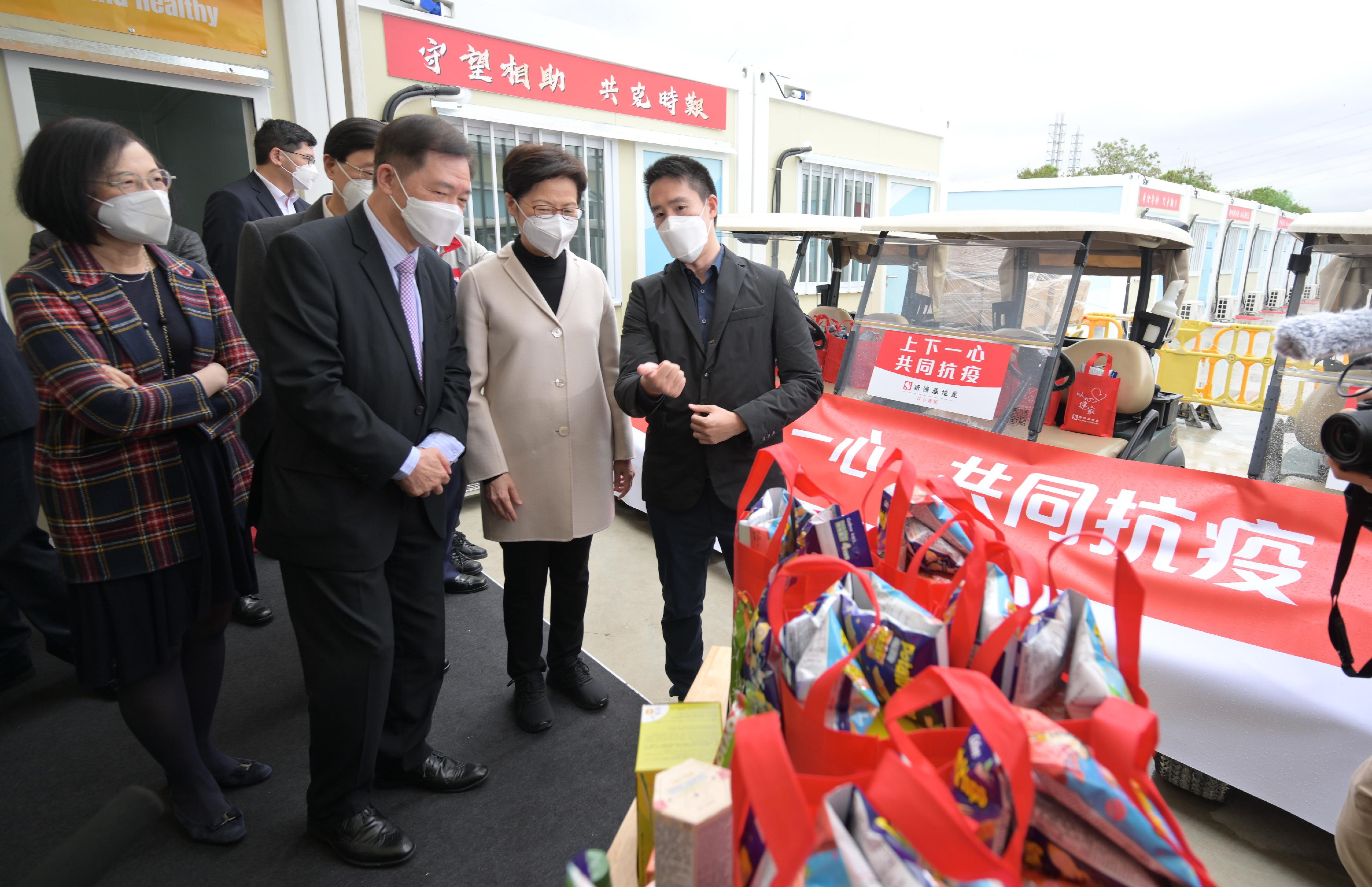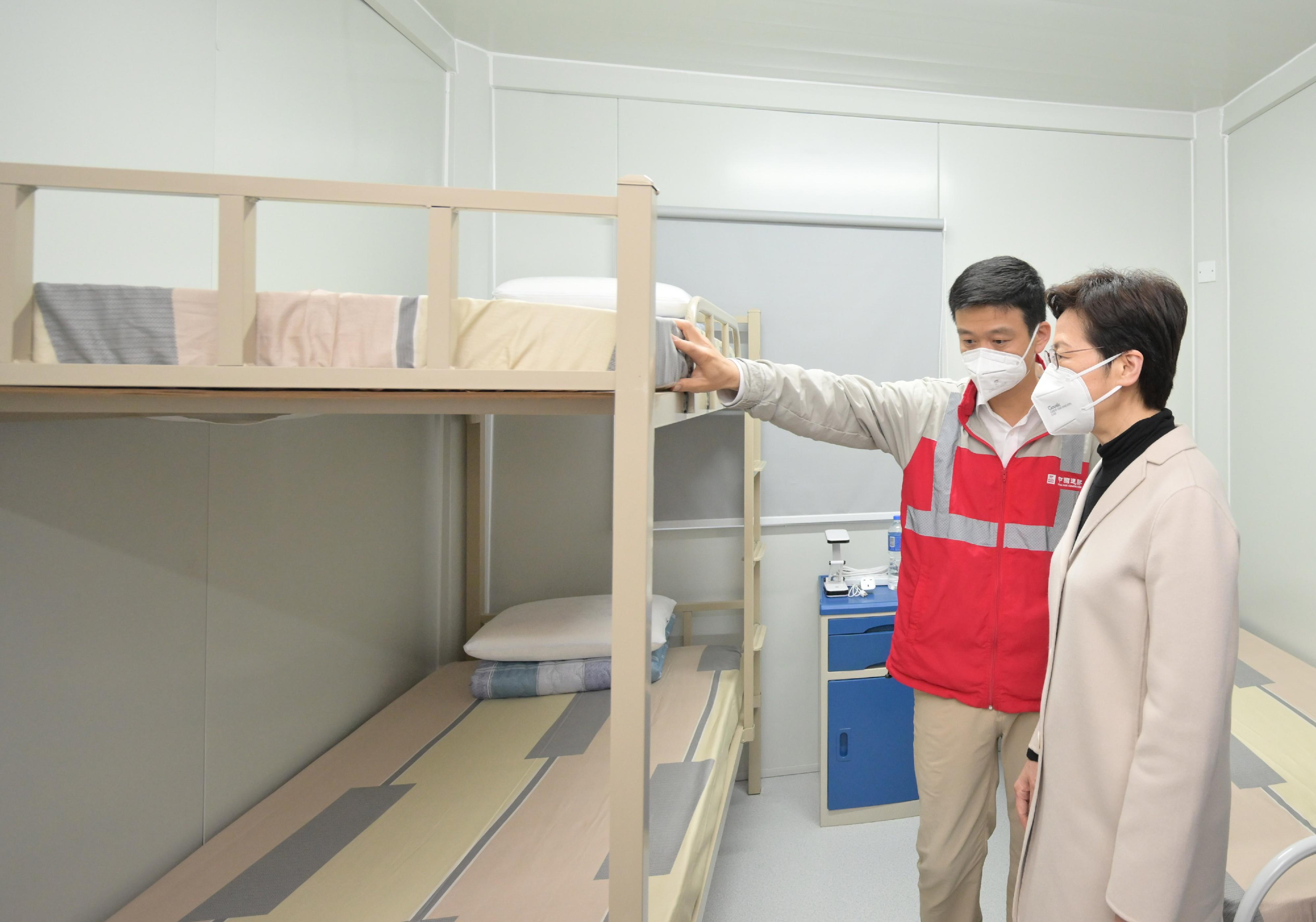 其後,林鄭月娥在政務司司長李家超、食物及衞生局局長陳肇始教授、發展局局長黃偉綸、保安局局長鄧炳強、發展局常任秘書長(工務)劉俊傑、衞生署署長林文健醫生、建築署署長何永賢和醫院管理局行政總裁高拔陞醫生陪同下視察隔離單位及設施,並聽取工作人員和承建商講解有關隔離設施的運作。