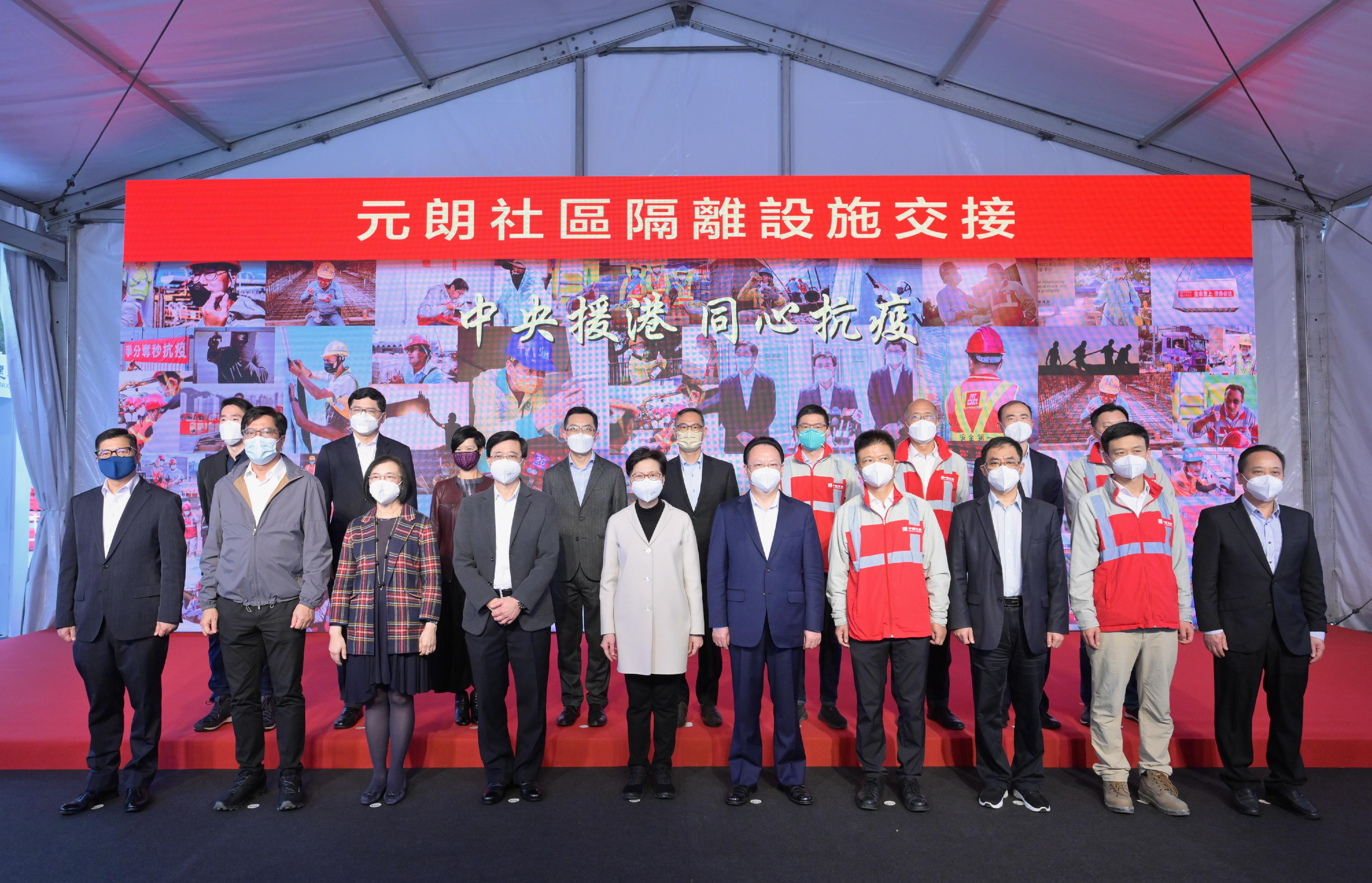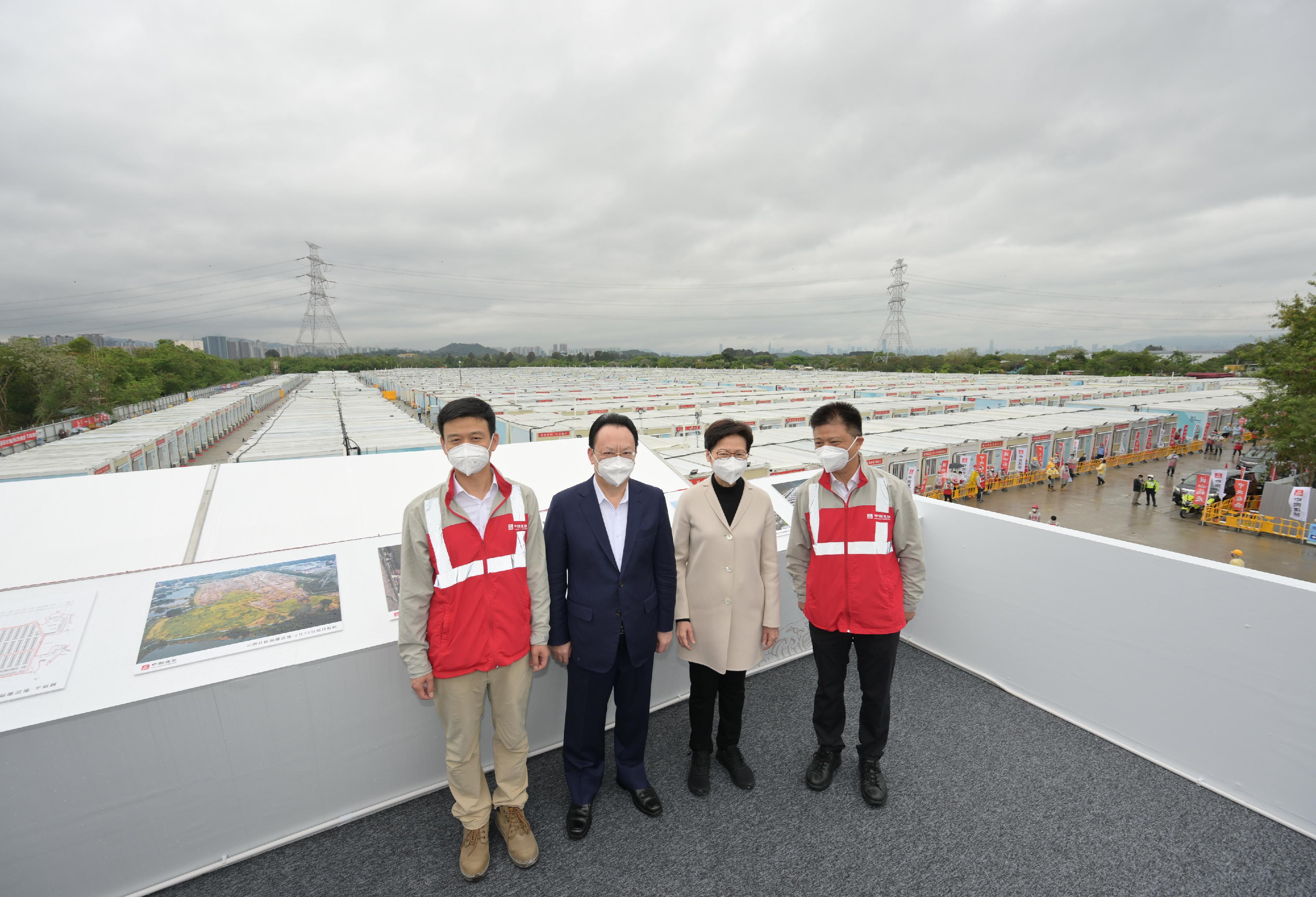 林鄭月娥與中央人民政府駐香港特別行政區聯絡辦公室(中聯辦)副主任譚鐵牛及承建商中國建築國際集團(中建集團)主席一同視察元朗社區隔離設施,聽取中建集團代表介紹項目規模和特點,以及施工挑戰。