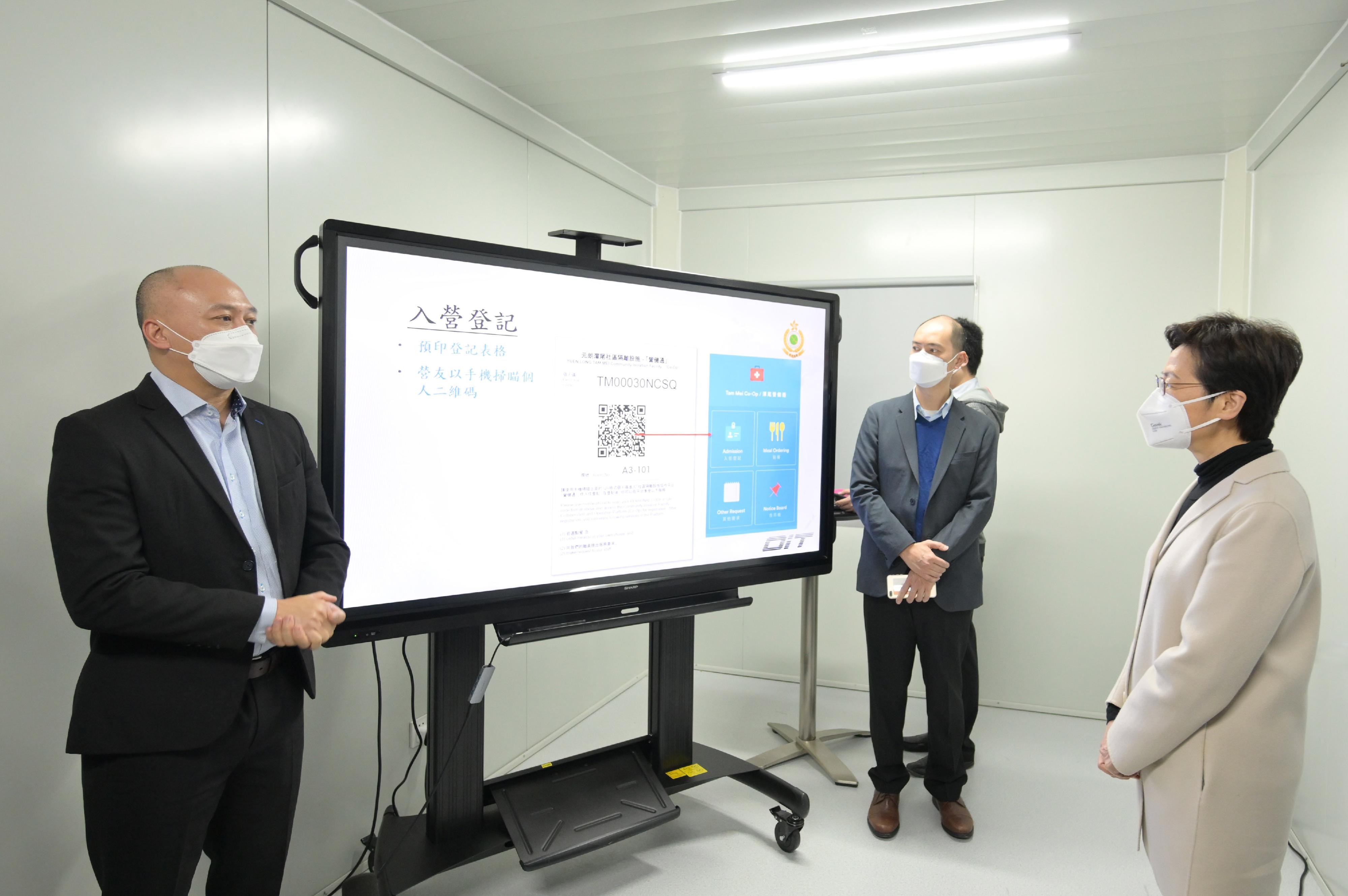 保安局抗疫特遣隊向林鄭月娥及其他嘉賓介紹在設施新增的「關愛小車」及電子管理平台「營健通」設備。「關愛小車」用以接載有需要長者或行動不便人士,方便他們在抵達設施後到房間安頓。「營健通」則供隔離人士輕鬆從手機掃描二維碼以登記入住資料及隨時提出物資和膳食需求,簡化運作流程及提升工作人員的管理效率,更好照顧隔離人士需要。