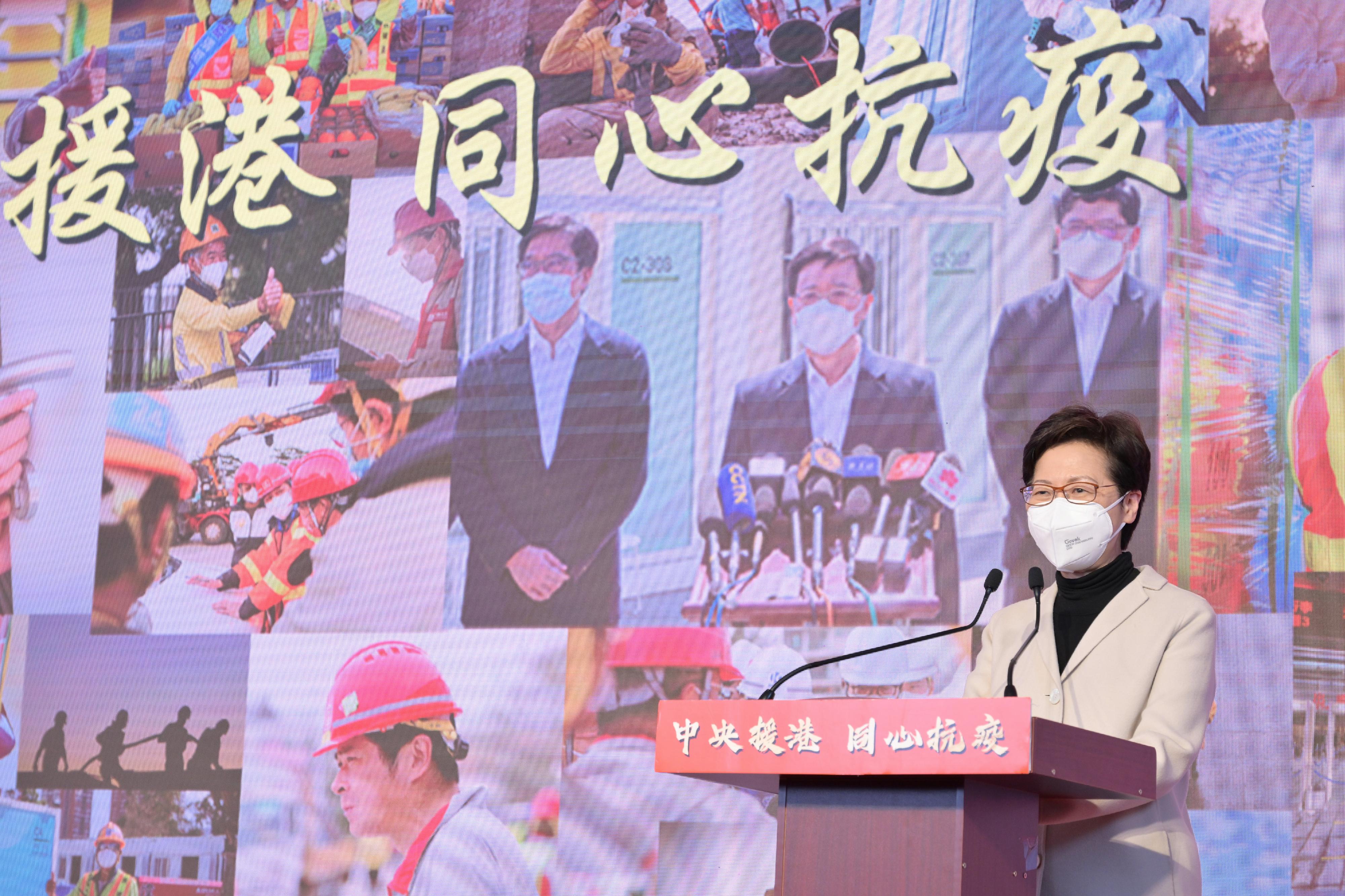 她再次感謝中央的全力支援、中聯辦的大力協調、建築團隊日以繼夜完成施工任務,以及三間發展商無償借出土地,展示民、商、官合作的精神。